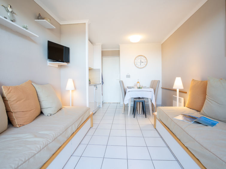 "L'Esquinade (G4 228)", apt 2 pièces 28 m2 au 1er étage. Rénové en 2019: séjour avec 2 divans-lits (80 cm, longueur 190 cm), TV (écran plat), air-conditionné. Sortie sur la terrasse. 1 petite chambre avec 1 grand-lit (140 cm, longueur 190 cm), ventilateur. Coin cuisine (2 plaques de cuisson, lave-vaisselle, grille-pain, bouilloire électrique, cafetière électrique, Capsules pour machine à café (Nespresso) (NON INCLUSES), combiné micro-ondes). Douche, WC séparé. Chauffage électrique. Terrasse 10 m2. Meubles de terrasse, barbecue électrique. Vue sur la mer. A disposition: lave-linge, fer à repasser, sèche-cheveux. Internet (Connexion WIFI, en sus). Place de parking No 2662 (couvert, 1 Voiture), hauteur 180 cm. Veuillez noter: logement non-fumeur. Détecteur de fumée. Annonce d'un particulier (art 155, IV du CGI).