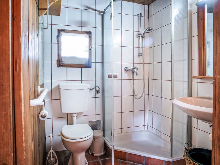 Chalet 4-kamers 120 m2 op 3 verdiepingen. Rustiek en gezellig ingericht: woon-/eetkamer met 1 divanbed, eethoek, Sat-TV, video, radio en tegelkachel. Uitgang naar de zitplaats in de tuin. Kleine, open keuken (4-pits kookplaat, oven, magnetron). Douche/WC. Bovenverdieping: (buitentrap), 2 kamers, elke kamer heeft 1 divanbed, 1 2-pers bed en Sat-TV. Douche/WC. Zolderverdieping: (buitentrap), 1 kamer met 1 divanbed, 1 2-pers bed, wastafel, aparte WC en Sat-TV. Balkon, zithoek in de tuin. Terrasmeubelen, ligstoelen. Mooi uitzicht op het landschap. Maximaal 2 huisdieren/honden toegestaan. Let op: steile buitentrap. Door het behoud van het originele karakter van het huis zijn zowel de deurposten als de hoogte van de ruimtes laag.
