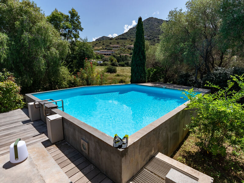 Monticello 3 km van Ile Rousse: Moderne, mooi villa. In de wijk Ornicciu, verhoogde ligging, 2.7 km van zee, 2.7 km van het strand. Voor medegebruik: wild terrein 2 ha. Voor alleengebruik: openluchtzwembad verwarmd (50 m2, 150 - 200 cm diepte, seizoensgebonden beschikbaarheid: 01.Apr. - 31.Okt.) met alarminstallatie. Toegangsweg (onverharde weg). Parkeerplaats bij het huis. Winkel 2.8 km, levensmiddelenwinkel 2.3 km, supermarkt 4.2 km, bakkerij 2.3 km, bushalte 350 m, treinstation "Ile Rousse" 3.5 km, zandstrand "Ile Rousse" 2.7 km, park "Saleccia" 5.2 km. Jachthaven 3.3 km. Attracties in de buurt: Ile Rousse 3.3 km, Calvi 27 km, San Antonino 16 km, L'Ostriconi 16 km. Auto noodzakelijk. Niet geschikt voor kleine kinderen.