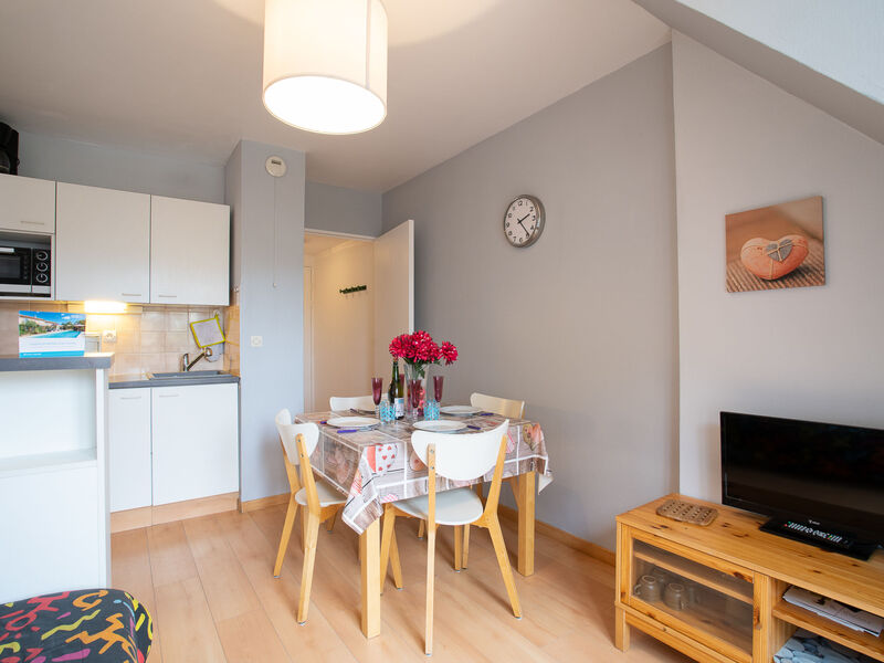 Appartement 3-kamers 34 m2 op de 1e verdieping, op het oosten gelegen. Gedeeltelijk afgeschuinde daken: woon-/eetkamer met TV (Flatscreen TV), CD-speler. Uitgang naar het balkon. 1 kamer met 1 uitschuifbaar bed (2 x 90 cm, lengte 200 cm). 1 kamer met 1 2-pers bed (140 cm, lengte 190 cm). Uitgang naar het balkon. Kookhoek (mini-oven, 2 keramische glas kookplaten, broodrooster, magnetron, elektrische koffiemachine). Douche, aparte WC. Elektrische verwarming, boiler. Parketvloeren. 2 balkons 5 m2. Balkonmeubilair. Ter beschikking: strijkijzer. Internet (WiFi, extra). Rookmelders.