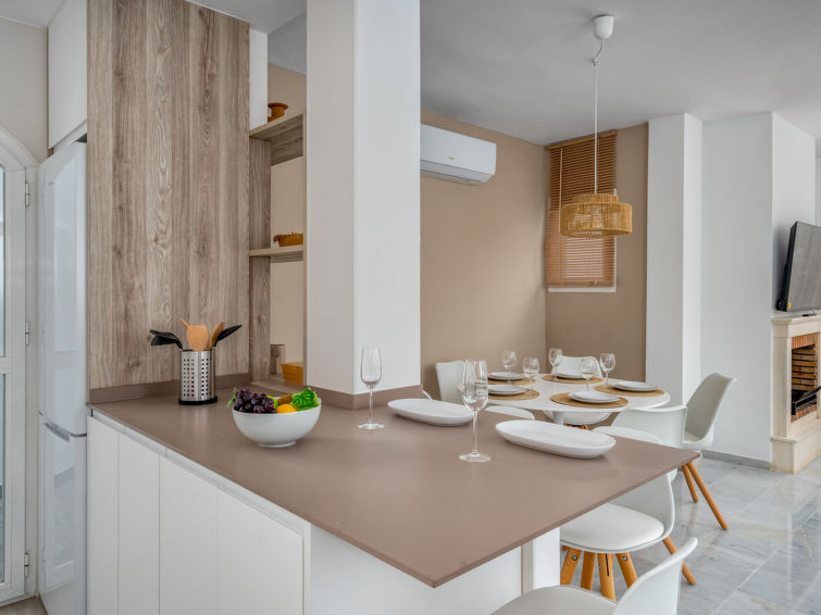 "Ático Los Pelicanos", dakappartement 3-kamers 74 m2, op het zuiden gelegen. Het objekt is geschikt voor 4 volwassenen. Licht, volledig gerenoveerd in 2023, zeer comfortabel en modern ingericht: woon-/eetkamer met open haard (alleen decoratie), eettafel, TV, internationale TV-zenders, Flatscreen TV, air-conditioning en heteluchtverwarming. Uitgang naar het terras. 1 kamer met 2 bedden (90 cm, lengte 190 cm), air-conditioning, ventilator en heteluchtverwarming. 1 kamer met 1 2-pers bed (180 cm, lengte 200 cm), bad/douche/WC, air-conditioning, ventilator en heteluchtverwarming. Uitgang naar het terras. Open keuken (oven, afwasmachine, 4 keramische glas kookplaten, broodrooster, waterkoker, magnetron, elektrische koffiemachine) met bar. Bad/douche/WC. Terras. Terrasmeubelen. Mooi uitzicht in de verte op zee. Ter beschikking: wasmachine, strijkijzer, kinderstoel, kinderbed tot 2 jaar, haardroger. Internet (WiFi, gratis). Parkeerplaats nr. 305 (1 Auto) bij het huis. Geschikt voor families. Niet rokers woning. Geen lift. VUT/MA/71063 // Reg. Nr.: ESFCTU0000290400000451630000000000000000VUT/MA/710638